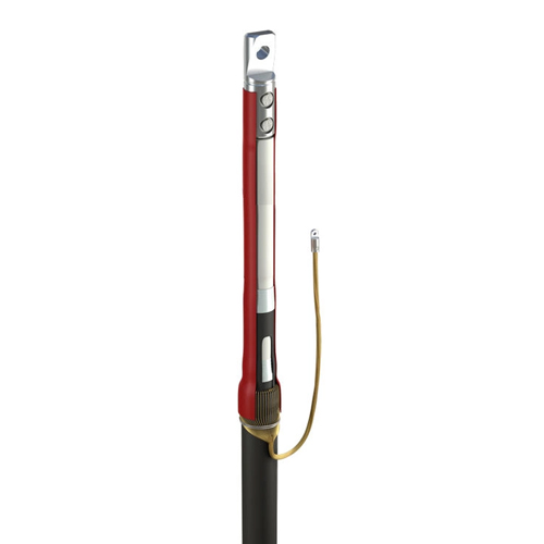 Для кабелей с проволочным экраном заземляющий провод формируется непосредственно из медных проволок экрана (6). Герметизация узла заземления достигается применением ленты-герметика (7). Для сглаживания напряженности электрического поля на участке полупроводящего слоя изоляции кабеля накладывается пластина выравнивания электрического поля (4), поверх пластины усаживается трубка-манжета (3). На жилу кабеля устанавливают наконечник с контактными срывными болтами или другим способом (опрессовкой, пайкой) по желанию заказчика (1). Для усиления фазной изоляции и эффективной защиты от воздействий окружающей среды и токов утечки на жилу кабеля усаживается трекингостойкая трубка с клеевым подслоем (цвет трубки - кирпично-красный)(2). Нижний конец трекингостойкой трубки перекрывает узел заземления, верхний — заходит на цилиндрическую часть наконечника, обеспечивая полную герметичность конструкции.