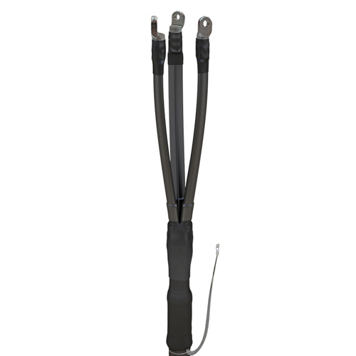 На разделанные жилы кабеля поверх жильной изоляции усаживаются изолирующие трубки (1). В корешок разделки устанавливается термоплавкий конусный заполнитель (11) с заданными проводящими свойствами для выравнивания напряженности электрического поля. Корешок разделки герметизируется изолирующей перчаткой с внутренним клеевым подслоем (2). На жилы кабеля устанавливаются наконечники с контактными срывными винтами (4) или оконцевание осуществляется другим способом (опрессовкой, пайкой) по желанию заказчика. Наконечники изолируются манжетами с клеевым подслоем (3). Соединение проводника заземления (7) с броней и оболочкой кабеля осуществляется самым надежным способом - пайкой (9). Узел заземления изолируется термоусаживаемой манжетой с клеевым подслоем (6). Для защиты корешка разделки от разрыва устанавливают термоусаживаемый распорный изолятор (8).
