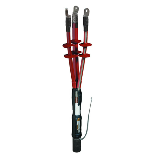 Заземляющий провод формируется непосредственно из медных проволок экрана. Герметизация узла заземления достигается применением высокоадгезионной ленты-герметика и бандажирующей манжеты. Для сглаживания напряженности электрического поля на участке полупроводящего слоя изоляции жил кабеля накладывается пластина выравнивания напряженности электрического поля. Поверх пластины усаживается экранирующая манжета. На жилу кабеля устанавливают наконечник с контактными срывными болтами (или наконечники под опрессовку, пайку) по желанию заказчика. Для изоляции жил кабеля и эффективной защиты от воздействия окружающей среды и токов утечки на жилу кабеля усаживается трекингостойкая трубка с клеевым подслоем (цвет трубки – кирпично-красный). Нижний конец трекингостойкой трубки усаживается на палец термоусаживаемой перчатки, верхний – заходит на цилиндрическую часть наконечника, обеспечивая полную герметичность конструкции. Поверх трекингостойких трубок усаживаются трекингостойкие изоляторы с клеевым подслоем.