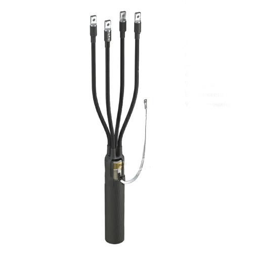 На разделанные жилы кабеля поверх жильной изоляции усаживаются изолирующие трубки (1). Корешок разделки герметизируется изолирующей перчаткой с внутренним клеевым подслоем (2). На жилы кабеля устанавливаются наконечники с контактными срывными винтами (4) или оконцевание осуществляется другим способом (опрессовкой, пайкой) по желанию заказчика. Наконечники изолируются манжетами с клеевым подслоем (3). Соединение проводника заземления (7) с броней кабеля осуществляется самым надежным способом - пайкой (8). Узел заземления изолируется термоусаживаемой манжетой с клеевым подслоем (6).